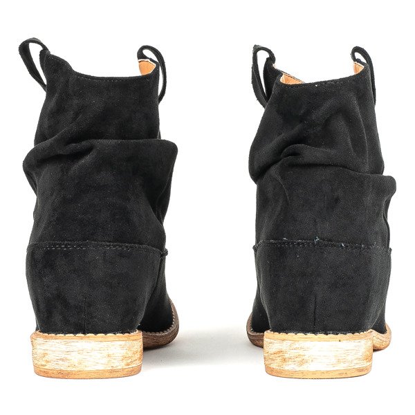 - Czarne botki a'la kowbojki wykonane ze skóry ekologicznej zamszowej. Model posiada ocieplenie w środku w formie miękkiego futerka. Obuwie na niskiej krytej koturnie. Buty bez zapięcia. Idealne na chłodniejsze dni.