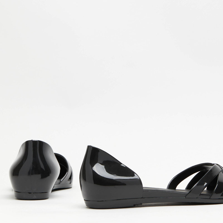 - Črne ženske balerinke iz gumijastega materiala. Na nosu okrasni izrezi. Vložek iz eko usnja. Idealni čevlji za poletne dni.