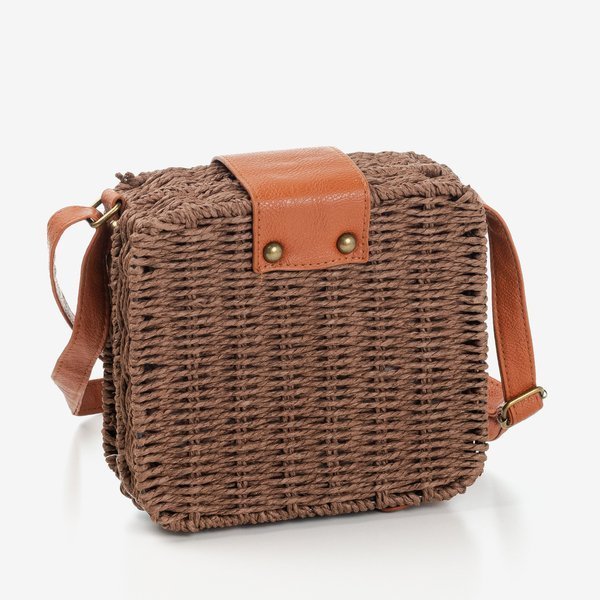 - Kwadratowa damska torebka typu kuferek wykonana z plecionej papierowej słomki w kolorze ciemnobrązowym. Posiadają zamknięcie na klamrę. Podszewka tkaninowa.