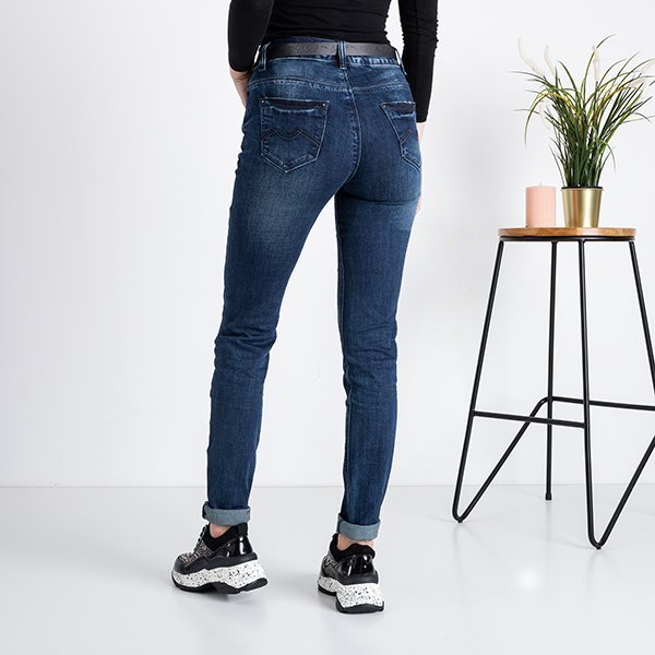 Royalfashion Granatowe damskie spodnie jeansowe z paskiem