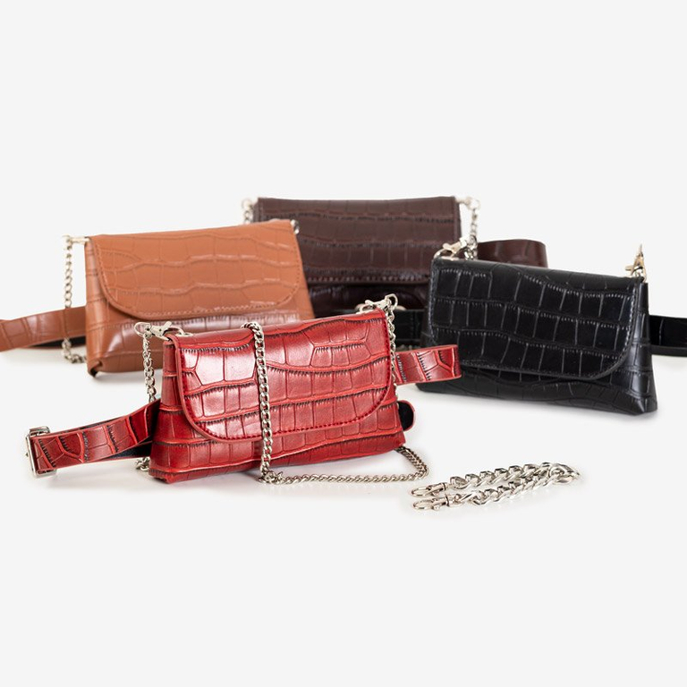 - Mała torebka damska na srebrnym łańcuszku, wykonana z eko-skóry i wykończona zwierzęcym tłoczeniem. Posiada dodatkowy cieńszy łańcuszek i paseczek z regulacją na którym można zawiesić torebkę i nosić ją w pasie.