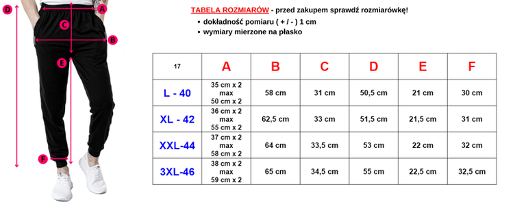 | [A] Szerokość w pasie (cm) | [B] Szerokość w biodrach (cm) | [C] Wysokość stanu (cm) | [D] Długość całkowita (cm) | [E][E] Wewnętrzna długość nogawki (cm) | [F] Szerokość nogawki na dole (cm) | ||||||||||||||||||