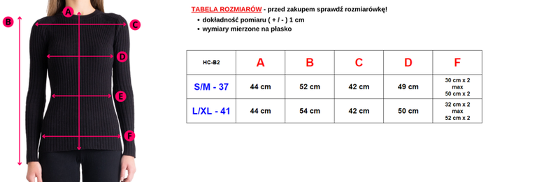 | [A] Długość całkowita (cm) | [B] Długość rękawa (cm) | [C] Szerokość w ramionach (cm) | [D] Szerokość w biuście (cm | [F] Szerokość na dole (cm) | |||||