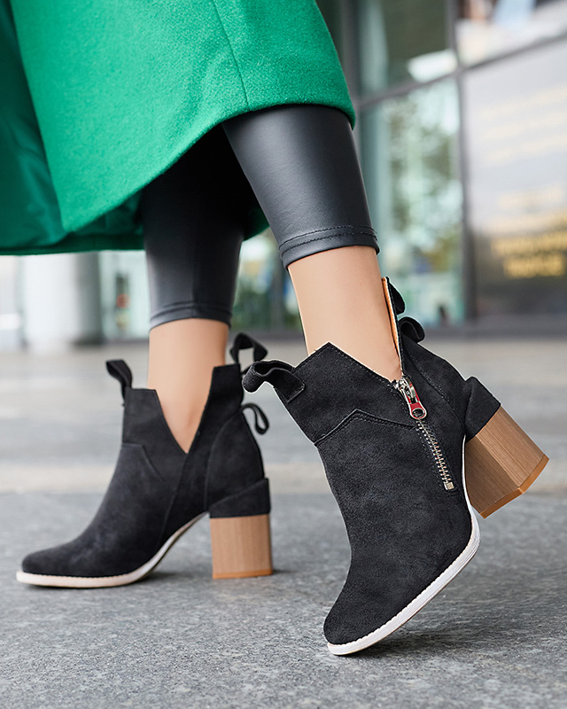 - Wyjątkowe damskie botki na słupku z okrągłym noskiem. Materiał wykonania to eko-skóra zamszowa, w środku eko-skórzana wkładka. Cholewka zapinana suwakiem, po boku posiada wycięcia. Idealne obuwie do tworzenia modnych i oryginalnych outfitów!