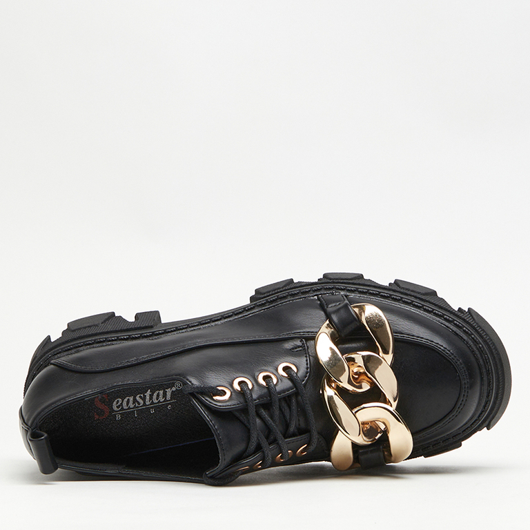 - Wyjątkowe półbuty damskie w stylu oxfordków, wykonane ze skóry ekologicznej. Cholewka sznurowana, zdobiona złotym elementem. Wkładka również z eko-skóry, podeszwa z tworzywa gumowego. Model jak najbardziej będzie się sprawdzał z eleganckimi stylizacjami!