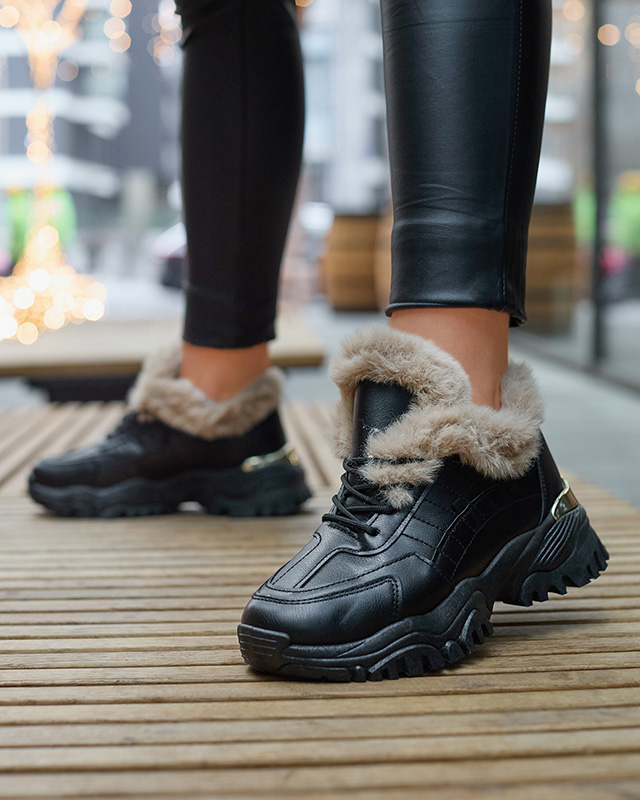 Royalfashion Sportowe czarne buty damskie z futerkiem Flixis