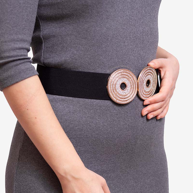 - Świetny szeroki pasek damski ze złotą klamrą z cyrkoniami. Model wykonany z połączenia skóry ekologicznej oraz gumy. Ten efektowny model idealnie pasuje do sukienek i spodni.