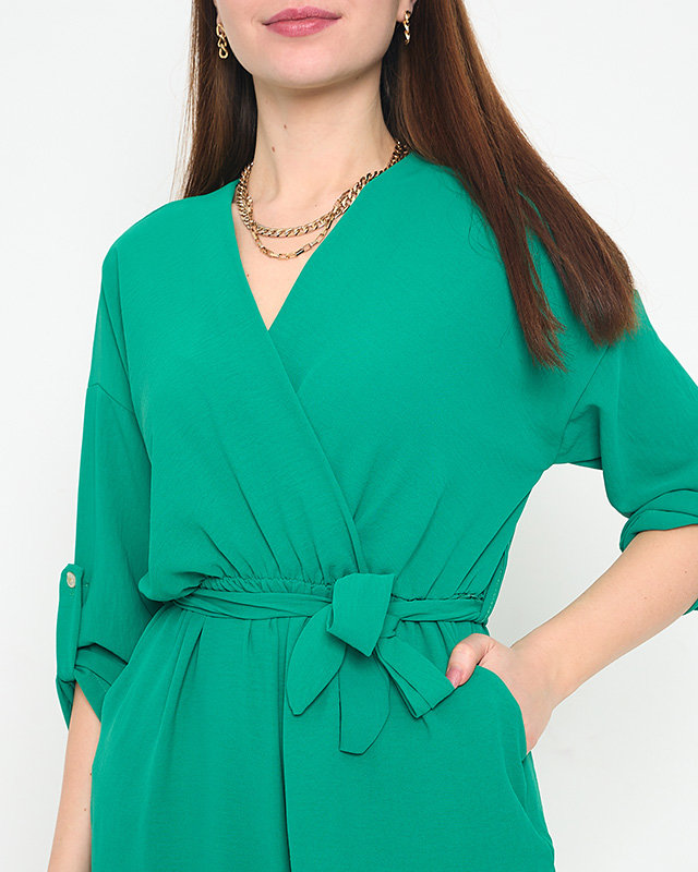 - Modny kombinezon damski z długimi, podpinanymi rękawami. Nogawki proste i szerokie, dekolt w serek z kopertowym przodem. Talia z elastyczną gumką i ozdobnym wiązaniem. UWAGA: Dokładność pomiaru (+/-) 1 cm.
