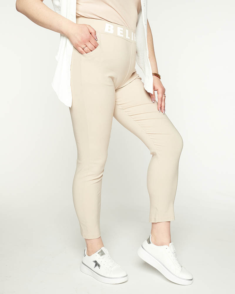 Royalfashion Beżowe damskie spodnie materiałowe z napisem PLUS SIZE