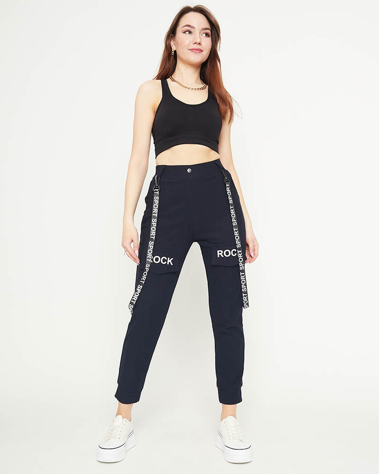 Royalfashion Granatowe damskie materiałowe spodnie typu bojówki z szelkami