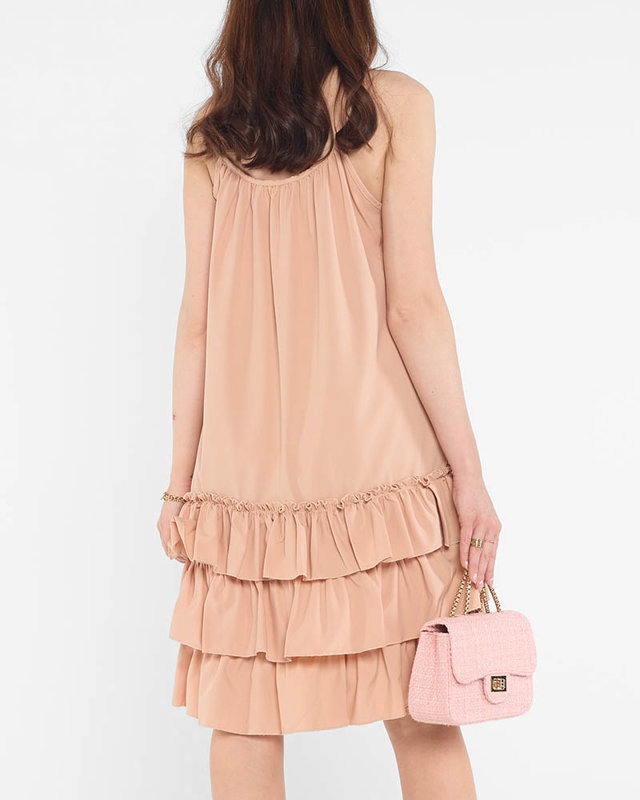 Camelowa damska sukienka na ramiączkach z falbankami - Odzież