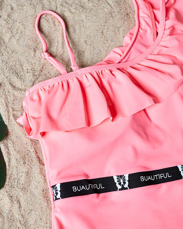 Różowy jednoczęściowy kostium kąpielowy damski z falbanką - Bielizna