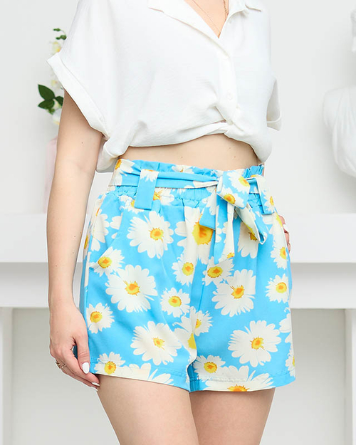 Royalfashion Niebieskie wzorzyste damskie materiałowe krótkie spodenki w kwiaty