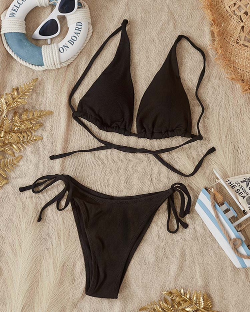 Czarny prążkowany dwuczęściowy strój kąpielowy damski PLUS SIZE - Bielizna