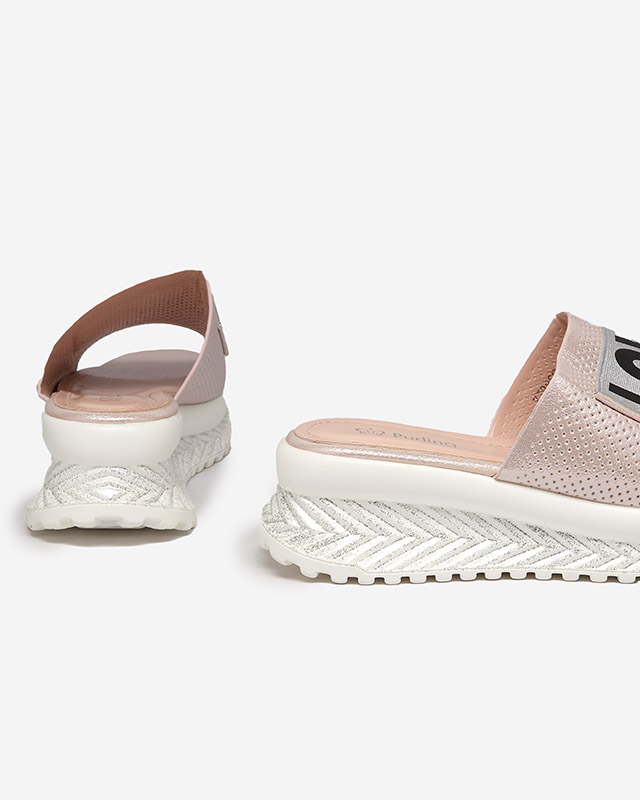 Różowe błyszczące klapki damskie z napisem Sosha- Obuwie