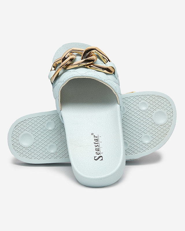 OUTLET Niebieskie damskie pikowane klapki ze złotym łańcuszkiem Eteris - Obuwie