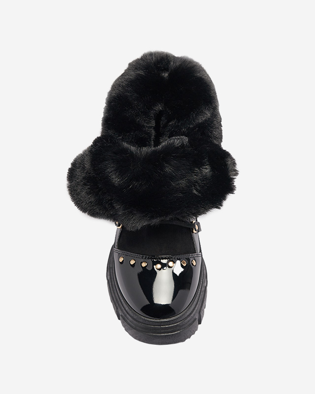 - Ciepłe damskie śniegowce na grubszej podeszwie, wykonane z połączenia skóry ekologicznej zamszowej i lakierowanej. Cholewka sznurowana, środek buta i góra cholewki ocieplone futerkiem. Na nosku ozdobne dżety. CZARNE BUTY ZIMOWE DAMSKIE ŚNIEGOWCE FENTES