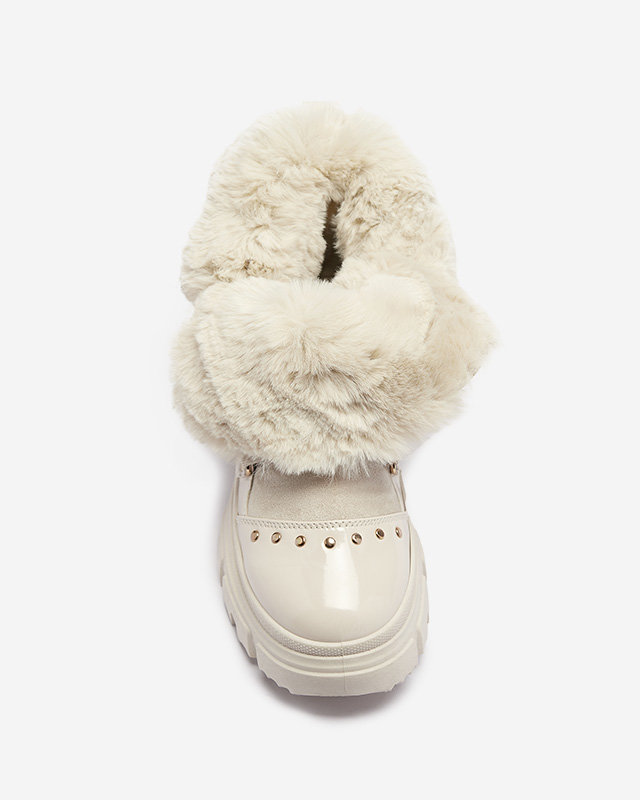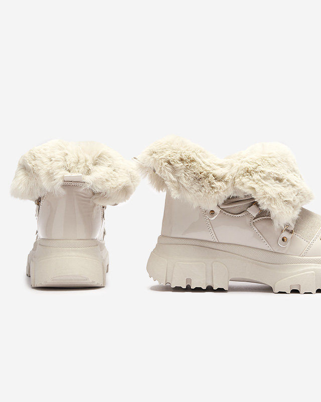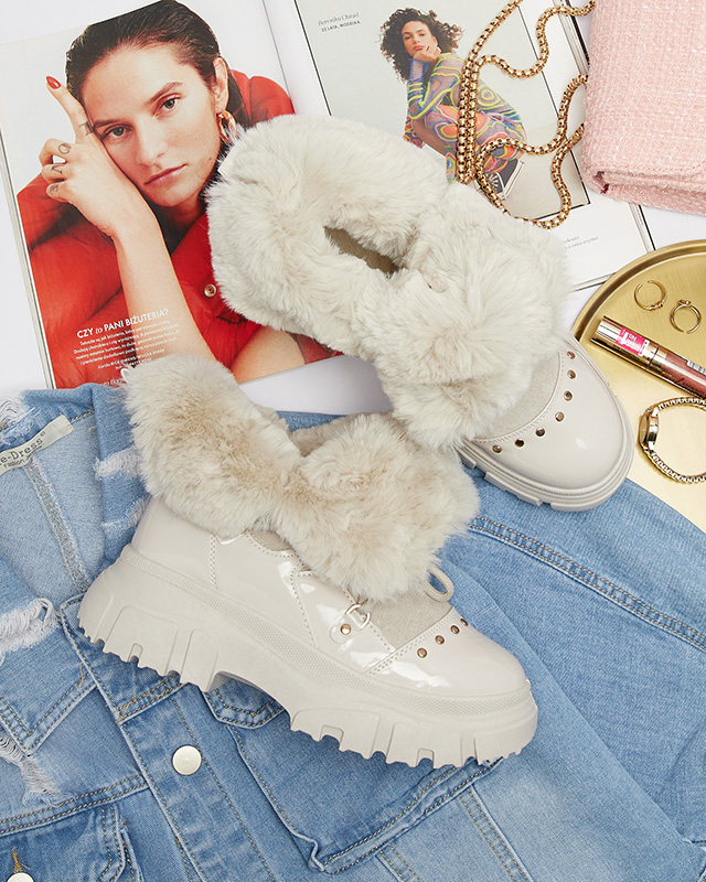 - Ciepłe damskie śniegowce na grubszej podeszwie, wykonane z połączenia skóry ekologicznej zamszowej i lakierowanej. Cholewka sznurowana, środek buta i góra cholewki ocieplone futerkiem. Na nosku ozdobne dżety. BEŻOWE BUTY ZIMOWE DAMSKIE ŚNIEGOWCE FENTES