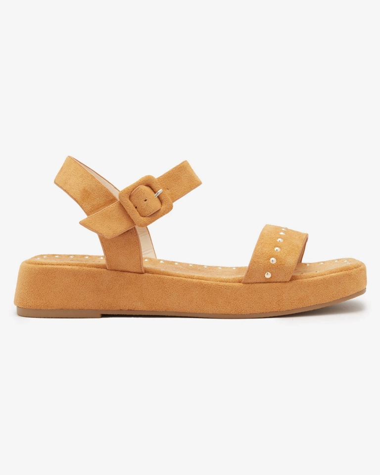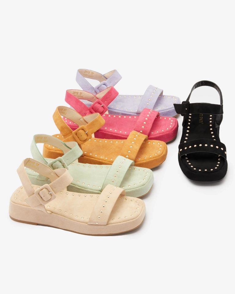 - Sandały damskie na grubej podeszwie, wykonane ze skóry ekologicznej zamszowej. Model zdobiony dżetami, zapinany na sprzączkę. Wygodne obuwie damskie na lato!
