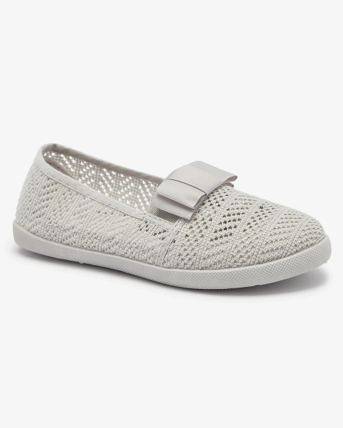- Przepiękne dziewczęce tenisówki typu slip on. Cholewka wykonana jest z ażurowego materiału tkaninowego, wkładka to również tkanina. Para jest zdobiona uroczą kokardką z przodu. Dodatkowo obuwie posiada gumową wstawkę ułatwiającą wsuwanie stopy do buta.