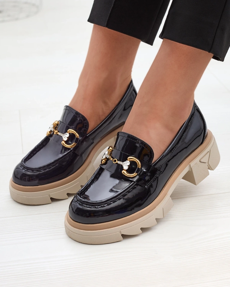 • Eleganckie damskie mokasyny na masywnej podeszwie. Model w tylu casual, wykonany ze skóry ekologicznej lakierowanej. Wkładka to skóra naturalna. Na nosku metalowa ozdoba z kryształkami. Idealna baza dla codziennych looków!