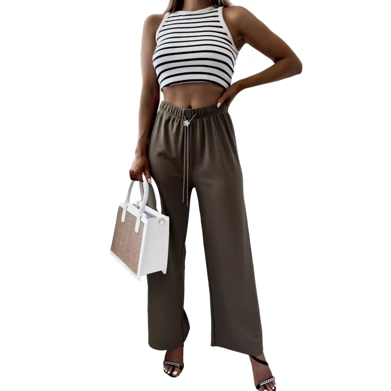 - Lekkie damskie szerokie spodnie, wykonane z prążkowanej tkaniny. Produkt posiada elastyczną gumę w pasie oraz troczki, które doskonale podkreślą talię. Must have tego sezonu! UWAGA: Dokładność pomiaru (+/-) 1 cm.