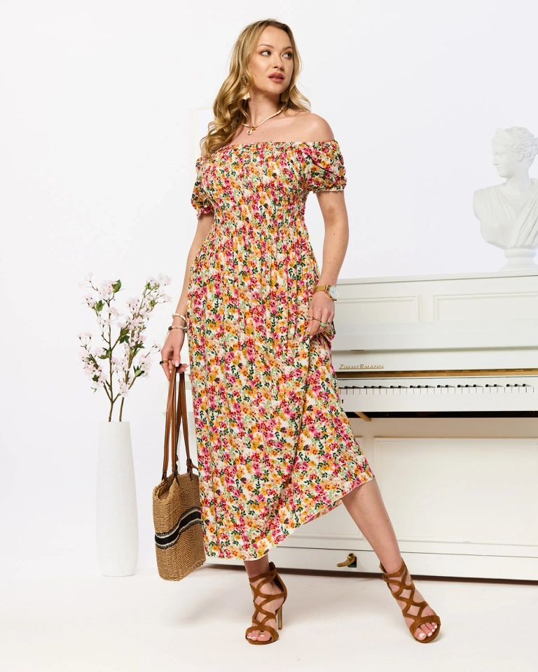 • Letnia damska sukienka o długości midi, wykonana z bawełnianej tkaniny we wzór w kwiaty. Model z okrągłym dekoltem a'la hiszpanka oraz gumą na szerokość biustu i talii. Model z krótkim rękawem. Załóż ją do sandałków! UWAGA: Dokładność pomiaru (+/-) 1 cm.