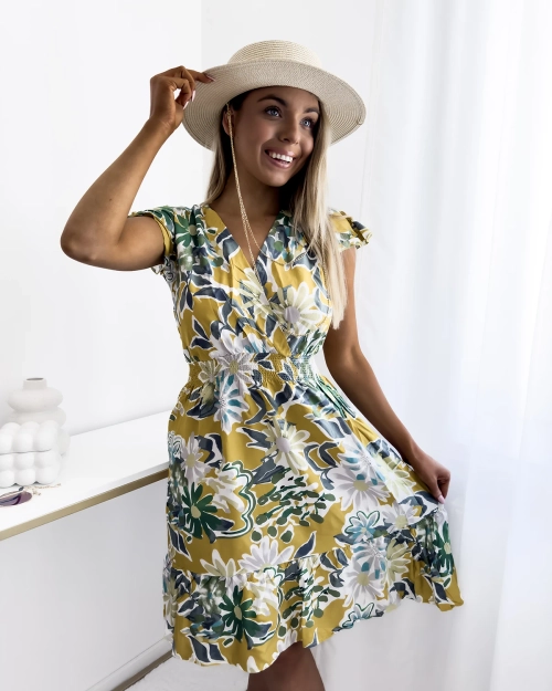 Royalfashion Musztardowa sukienka damska mini z printem w kwiaty