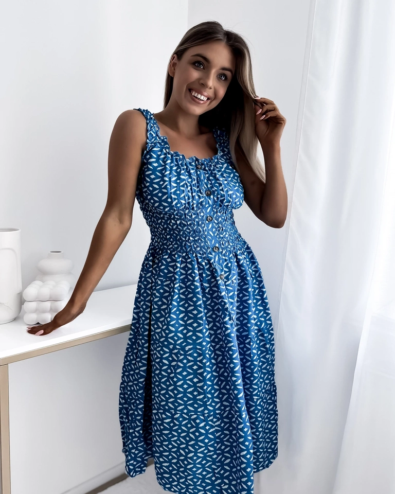 - Damska sukienka za kolano, wykonana z lekkiej tkaniny zdobionej printem. Model z okrągłym dekoltem oraz gumą na szerokość talii. Model na ramiączkach. Świetna na lato! UWAGA: Dokładność pomiaru (+/-) 1 cm.