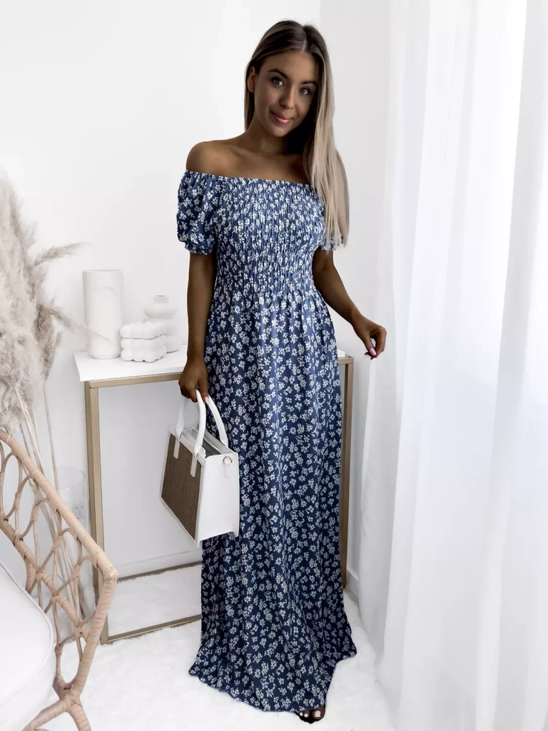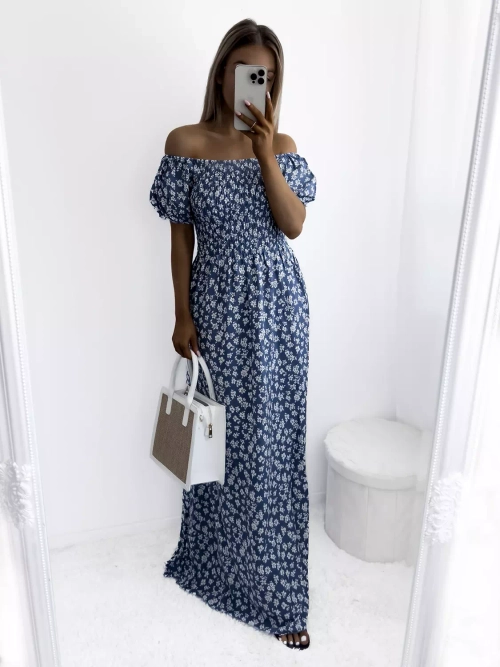 Royalfashion Niebieska sukienka damska maxi we wzór w kwiaty