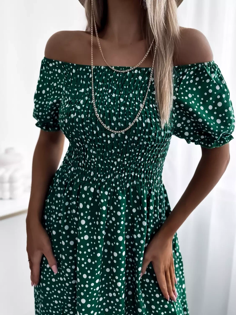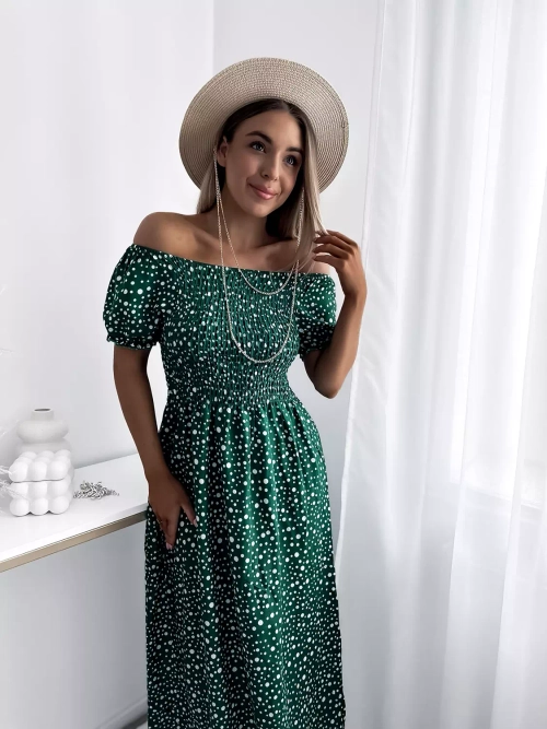 - Wiosenna sukienka damska maxi w groszki, wykonana z bawełnianej tkaniny. Model z okrągłym dekoltem a'la hiszpanka oraz gumą na szerokość biustu i talii. Model z krótkim rękawem. Załóż ją na spacer! UWAGA: Dokładność pomiaru (+/-) 1 cm.
