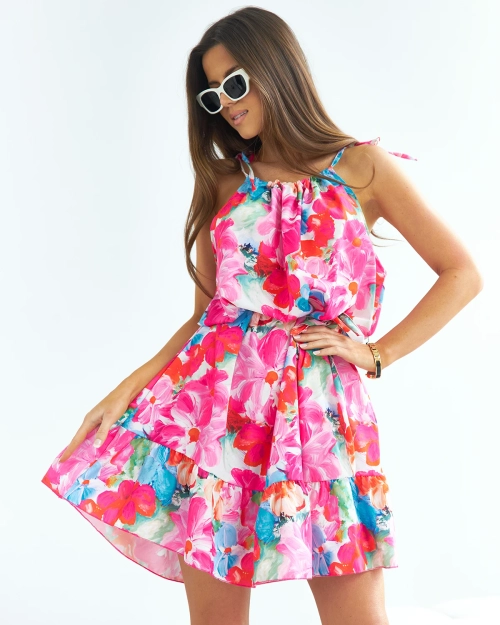- Lekka damska krótka sukienka wykończona kolorowym wzorem. Model na ramiączkach, posiada okrągły i regulowany dekolt. Dół sukienki zakończony falbanką. Dodatkowo w zestawie cienki, materiałowy paseczek. UWAGA: Dokładność pomiaru (+/-) 1 cm