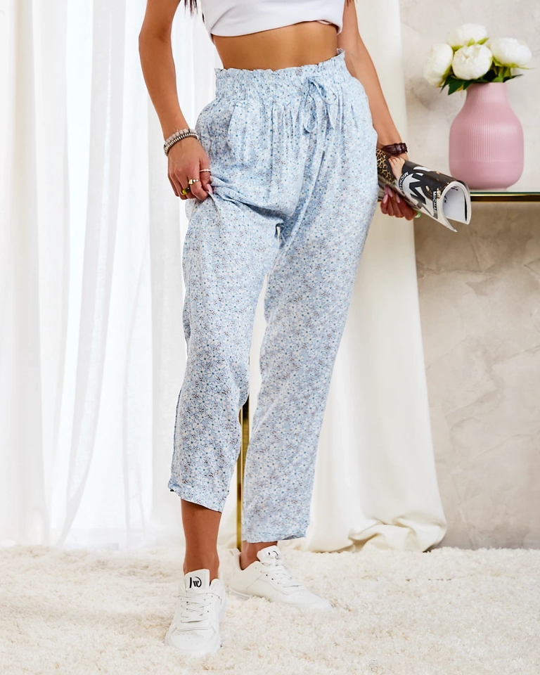 Royalfashion Niebieskie damskie bawełniane spodnie w kwiaty