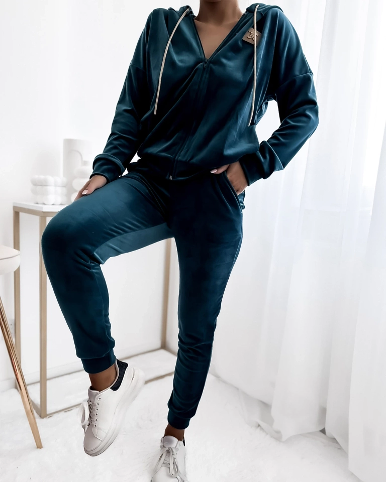 - Ženska jopica iz mehkega materiala a'la velur. Mikina je okrašena z našitkom, ima kapuco, zavezane hlače in 2 žepa. Hlače s širokim elastičnim pasom in 2 žepoma z naramnicami. OPOMBA: Natančnost merjenja (+/-) 1 cm.