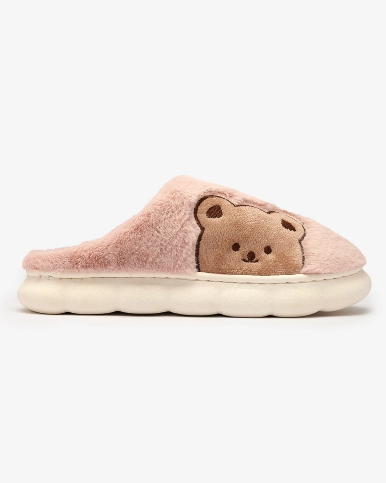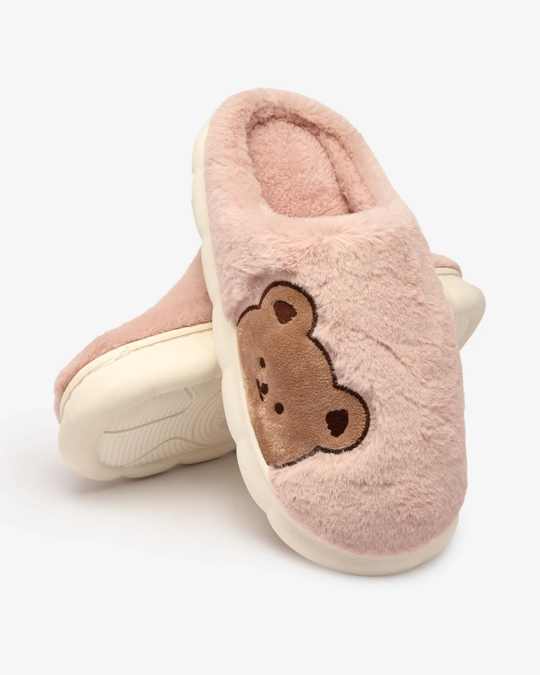 - Simpatični ženski copati na ravnem podplatu, okrašeni z našitkom medvedka. Model je izdelan iz materiala, ki posnema krzno. Odlična izbira za domače obleke!