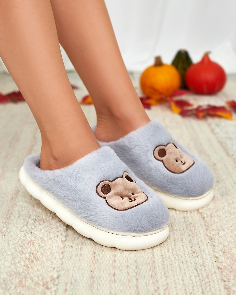 • Edinstveni ženski copati na ravnem podplatu, okrašeni z našitkom medvedka. Model je izdelan iz materiala, ki posnema krzno. Odlična izbira za domače obleke!