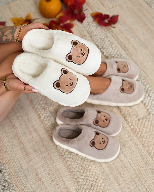 - Edinstveni ženski copati na ravnem podplatu, okrašeni z našitkom medvedka. Model je izdelan iz materiala, ki posnema krzno. Odlična izbira za domače obleke!