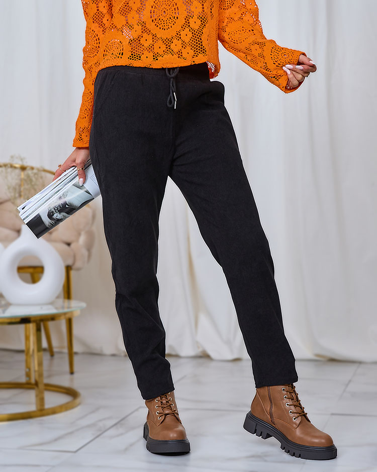 - Senzacionalne ravne hlače za ženske iz manšete. Model ima elastičen pas z nastavljivimi vezalkami. Poleg tega so na sprednji strani opremljene z dvema žepoma z drsnim robom. Odlične za ustvarjanje elegantnih oblačil!