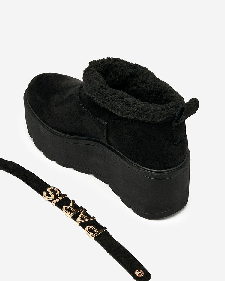 • Mega elegantni ženski izolirani snežni škornji iz ekološkega semiš usnja. Imajo sredino, napolnjeno s krznom a'la ovčja koža. Poleg tega so odstranljivi as, okrašen z napisom. Čevlji na visoki platformi - kot nalašč za zimske priložnostne obleke!