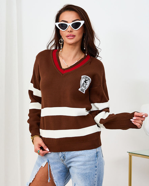 - Ta klasični pulover je bistvo udobja in šarma. Pulover je izdelan iz mehkega materiala, ima srčast izrez in dolge rokave. Črtast vzorec mu doda edinstven čar!