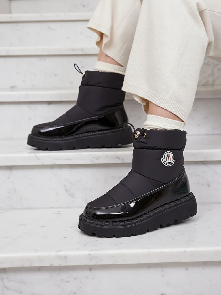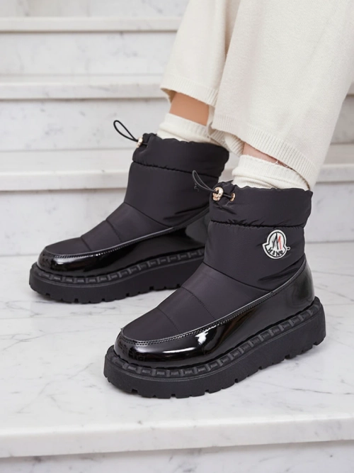 - Brezčasni ženski snežni škornji. Zgornji del modela iz materiala a'la oljna tkanina in vložki iz lakiranega eko usnja. Notranjost je izolirana v obliki krzna, čevlji pa drsijo in imajo šivanko. Odlični za hladnejšo sezono!