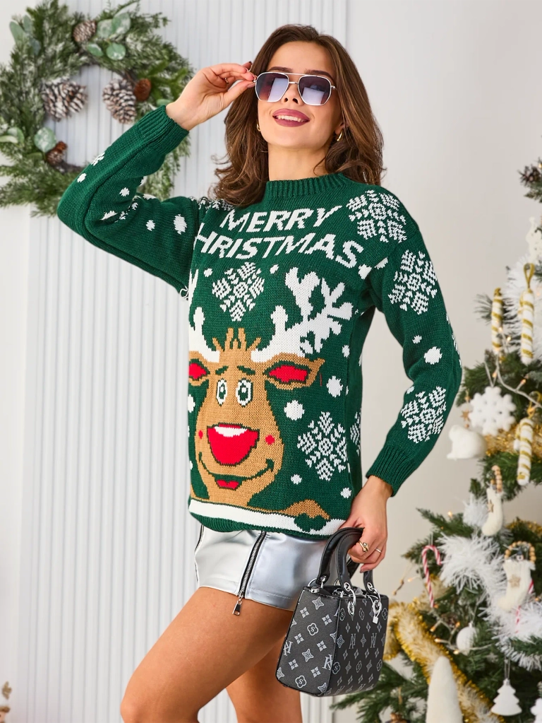 - Božični pulover s severnim jelenom je prikupen dodatek k vaši omari! Mehka pletenina, nasmejani severni jeleni in praznični vzorci bodo poskrbeli, da boste začutili čarobnost božiča. Odličen za družinska srečanja in zimske večere, polne topline!