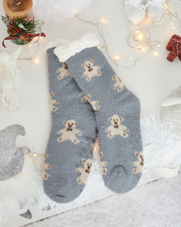 • Lepe debele ženske nogavice z vzorcem z medvedki. V notranjosti so izolirane z belo toplo ovčjo kožo. Nogavice so odlične za hladnejše večere!