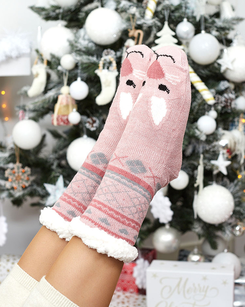 - Przepiękne damskie grube skarpety wykończone świątecznym wzorem z antypoślizgowym spodem. W środku ocieplane białym, cieplutkim kożuszkiem. Skarpetki świetnie się sprawdzą na chłodniejsze wieczory.