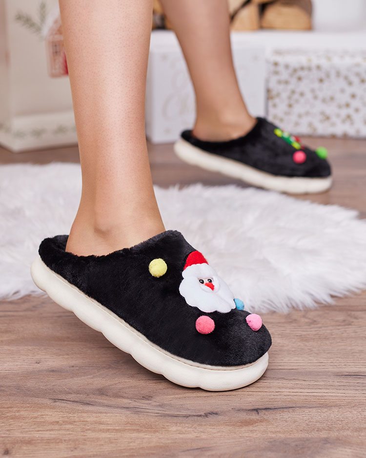 - Simpatični ženski copati na ravnem podplatu, okrašeni z božičnimi našitki. Model je izdelan iz materiala, ki posnema krzno. Odlična izbira za domače obleke!
