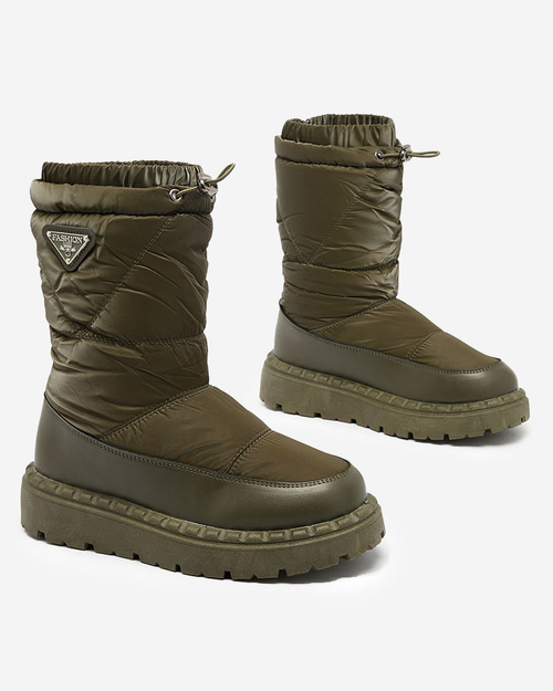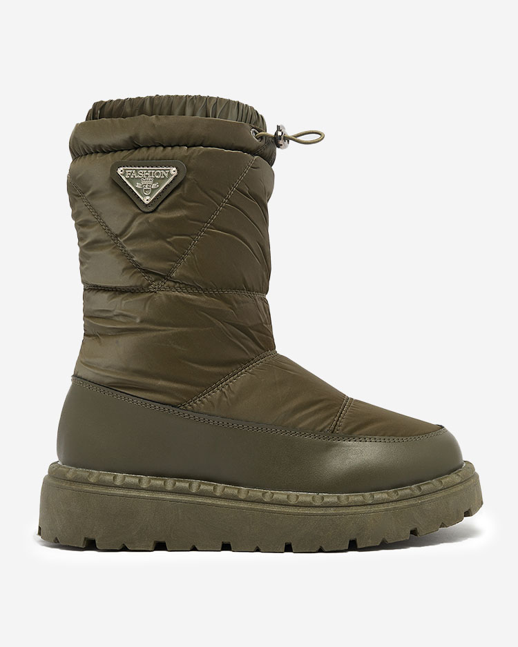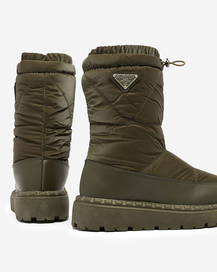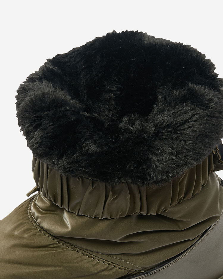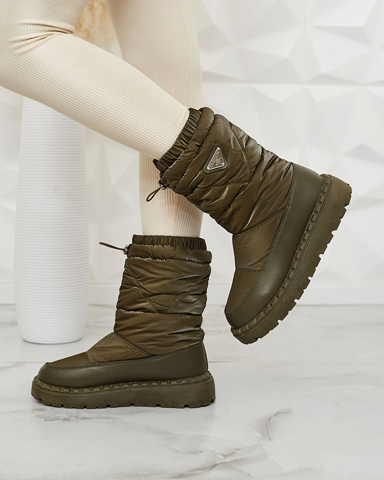 - Senzacionalni ženski snežni škornji. Zgornji del je izdelan iz materiala a'la cerata in vložkov iz ekološkega usnja. V notranjosti je izolacija v obliki krzna, obutev pa ima šivanko. Odlično za zimski čas!
