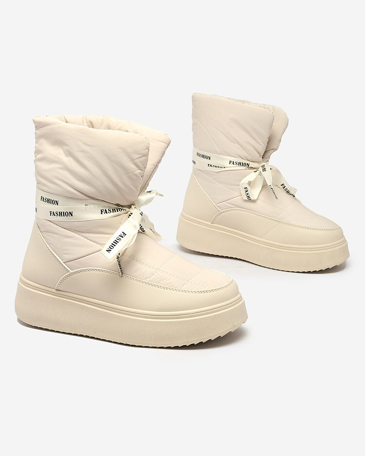 - Senzacionalni ženski snežni škornji. Zgornji del je izdelan iz materiala a'la cerata in vložkov iz ekološkega usnja. V notranjosti je ogrevanje v obliki krzna, čevlji so drsni in imajo trak. Odlični za hladnejšo sezono!