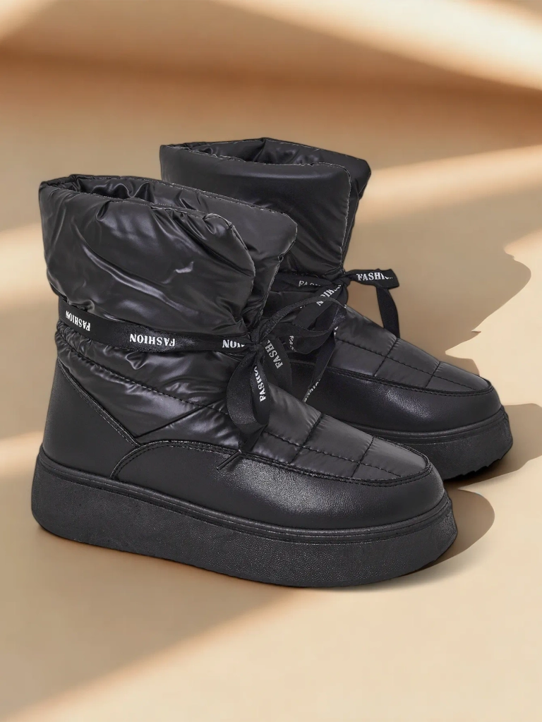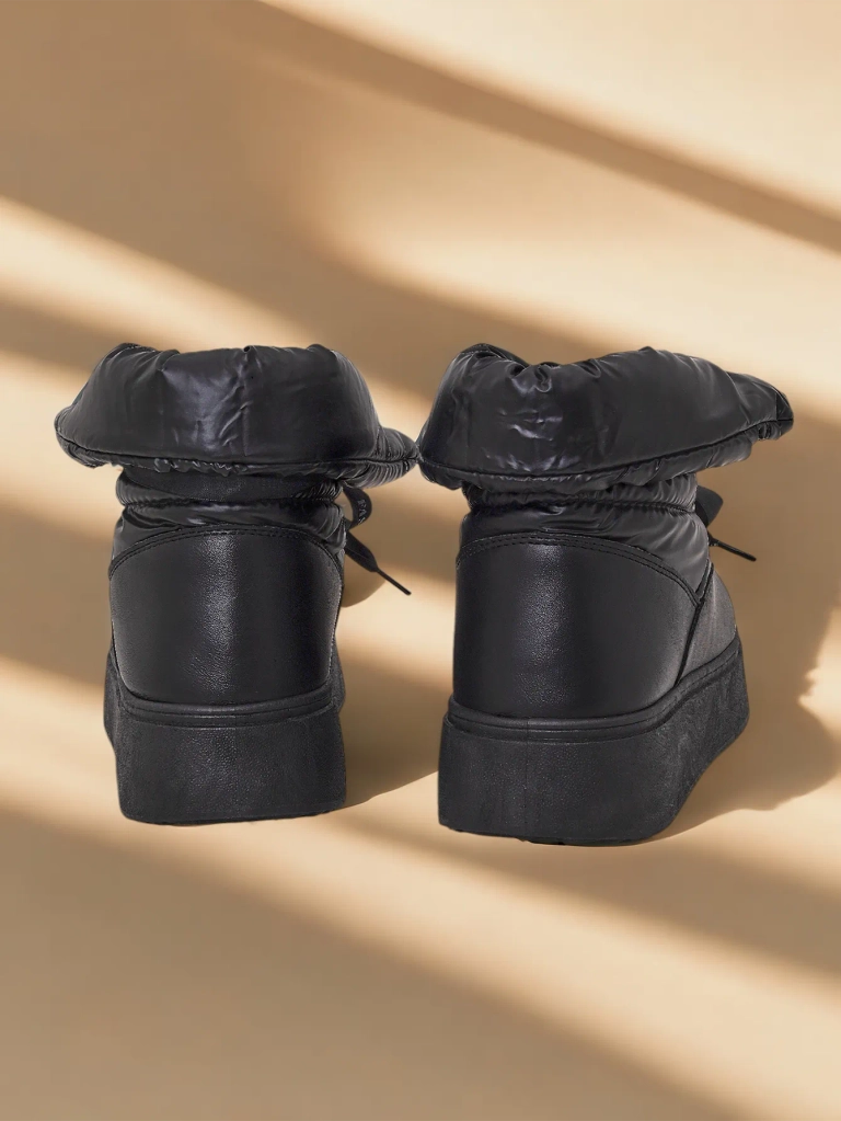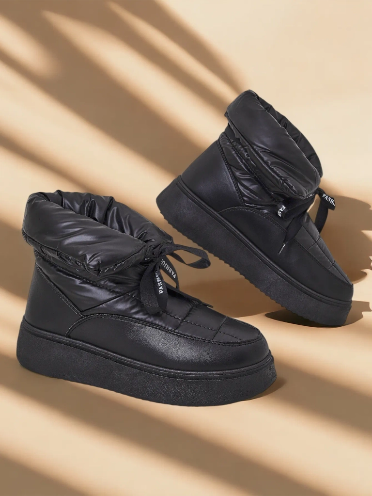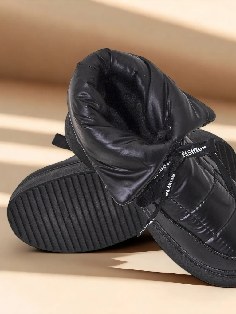 - Senzacionalni ženski snežni škornji. Zgornji del je izdelan iz materiala a'la cerata in vložkov iz ekološkega usnja. V notranjosti je ogrevanje v obliki krzna, čevlji so drsni in imajo trak. Odlični za hladnejšo sezono!