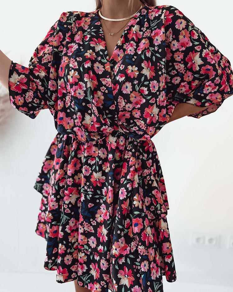 - Lepa ženska mini obleka je izdelana iz lahkega materiala z izvirnim vzorcem. Na višini pasu se razteza elastična elastika. Izdelek ima kratke rokave, srčast izrez in širok spodnji rob.