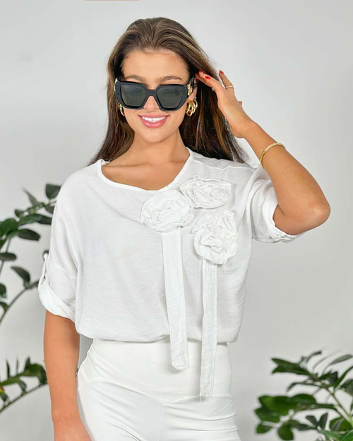 - Ženska bluza iz mehkega materiala. Kratki rokavi in okrogel vratni izrez, okrašen s cvetovi iz blaga, dodajo prefinjen pridih. Odlična za vsakodnevno nošenje!